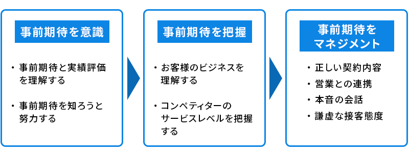 - 次のステップでお客様の事前期待を把握する。このためには、お客様のビジネスプロセスを理解し、コンペティターのサービスレベルを把握する。そして、事前期待をコントロールするマネジメント力を身につける。
